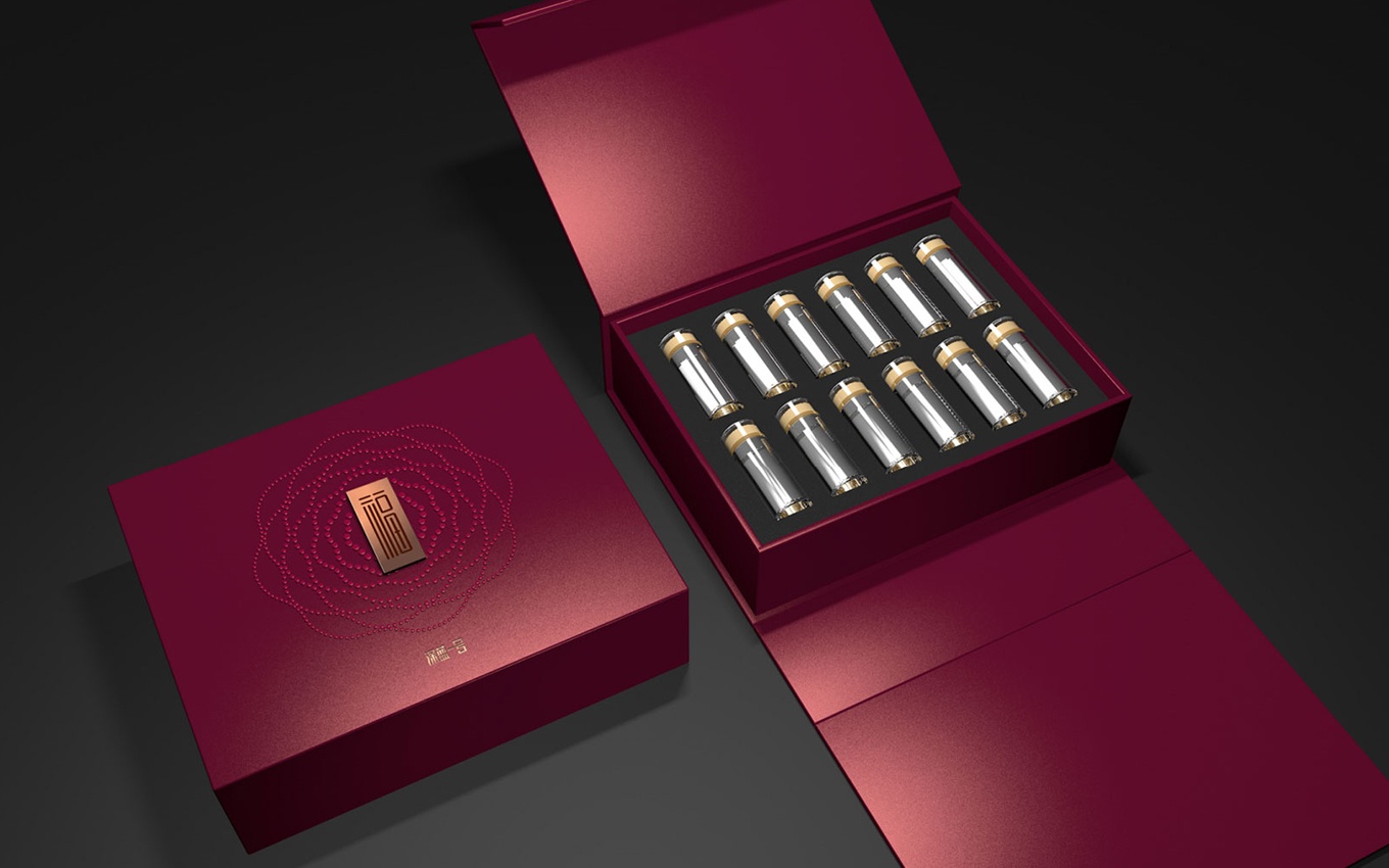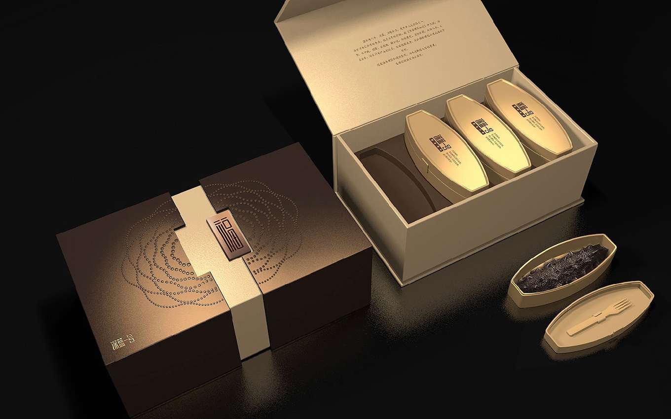 在此次海參禮盒的包裝設計中,我們以中國傳統文化為創意出發點,注入了壽、福、燕、祿等寓意美好生活的祝福言語,滿足創新消費人群對于個性化需求的追求。同時,我們結合高端禮品所需具備的氣質和儀式感,設計出了一款高品質的海參禮盒包裝。